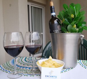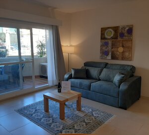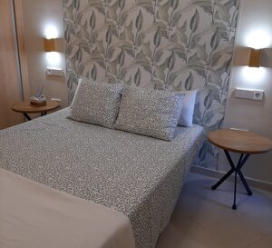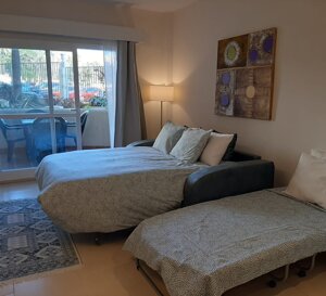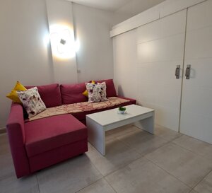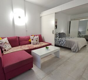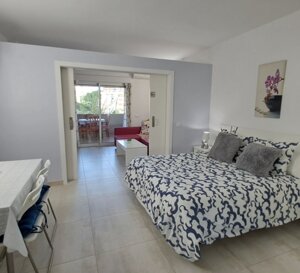 Monolocale Suite di 50 mq con vista mare, letto matrimoniale, divano letto, cucina completamente attrezzata, fuochi induzione, frigorifero, microonde, lavatrice, ferro da stiro, aria condizionata, asciugacapelli, TV e WIFI gratuita. Parcheggio comunitario gratuito. Entrata gratuita alle piscine comunitarie