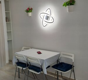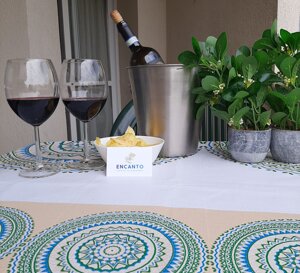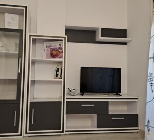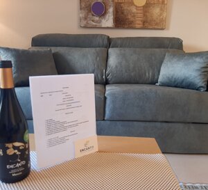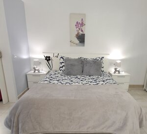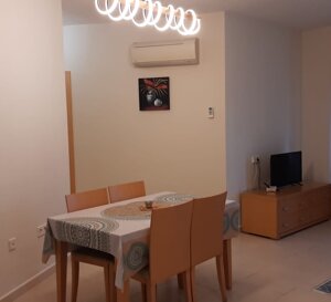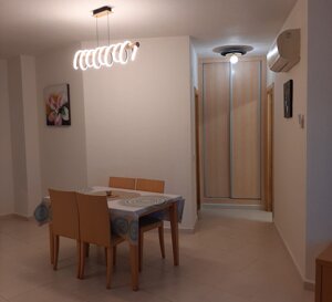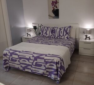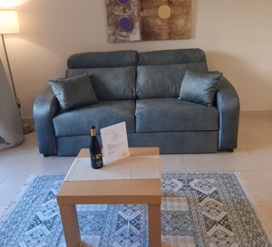 Appartamento di 70 mq con vista giardino, camera matrimoniale, ampio soggiorno con un divano letto matrimoniale e un letto singolo, cucina completamente attrezzata, con forno elettrico, fuochi induzione, microonde, frigorifero, lavastoviglie, lavatrice, ferro da stiro, asciugacapelli, aria condizionata, TV e WIFI gratuita, terrazzo, parcheggio comunitario gratuito, entrata gratuita alle piscine