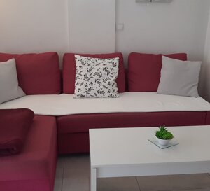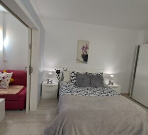 Apartamento Vista Jardín de 70 m², un dormitorio doble, un amplio salón con un sofás cama doble y una cama individual, terraza, cocina totalmente equipada, nevera, horno eléctrico, placa de inducción, microondas, lavavajillas, lavadora, plancha, secador de pelo, aire acondicionado, TV, WIFI gratis, aparcamiento comunitario gratuito, acceso gratuito a las piscinas.