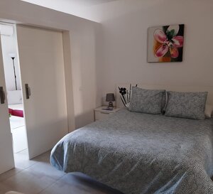 Estudio Suite Vista Mar de 50 m², cama doble, sofá cama, cocina totalmente equipada, fuegos eléctricos, microondas, nevera, lavadora, plancha, secador, aire acondicionado, TV, WIFI, terraza con vista al mar, aparcamiento comunitario gratuito y acceso gratuito a las piscinas.